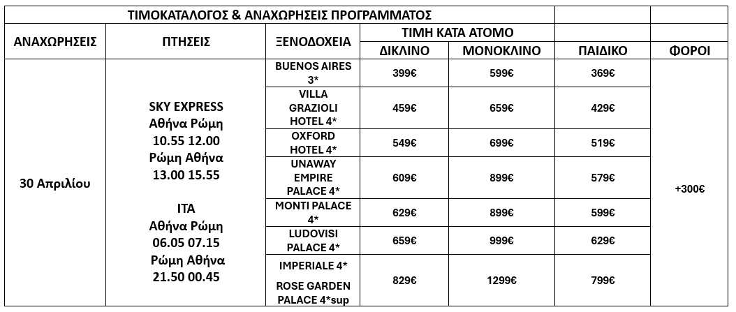 Rome city tax € 7.5 (for 4* hotels) / € 6 (for 3* hotels) per day per person