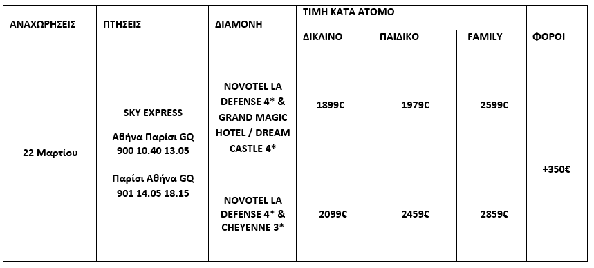 Νέος φόρος πόλης (city tax) υποχρεωτικός και πληρωτέος στα ξενοδοχεία του Παρισιού/ Grand Magic/Dream Castle : € 8,45 κατ’ άτομο τη διανυκτέρευση για 4* ξενοδοχεία. Τα παιδιά κάτω των 12 ετών δεν πληρώνουν στην περίπτωση που μένουν με 2 ενήλικα άτομα στο ίδιο δωμάτιο. Στην περίπτωση που μία οικογένεια (2 ενηλ + 2 παιδιά) καταλαμβάνει 2 δίκλινα δωμάτια, θα πληρώσουν και τα 4 άτομα τα city taxes. Φιλοδωρήματα, αχθοφορικά και ότι δε αναφέρεται στο πρόγραμμα.