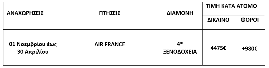 Αεροπορικά εισιτήρια (οικονομική θέση): Με πτήσεις της Air France (περιλαμβάνεται αποσκευή) και Tahiti Nui εσωτερικά
