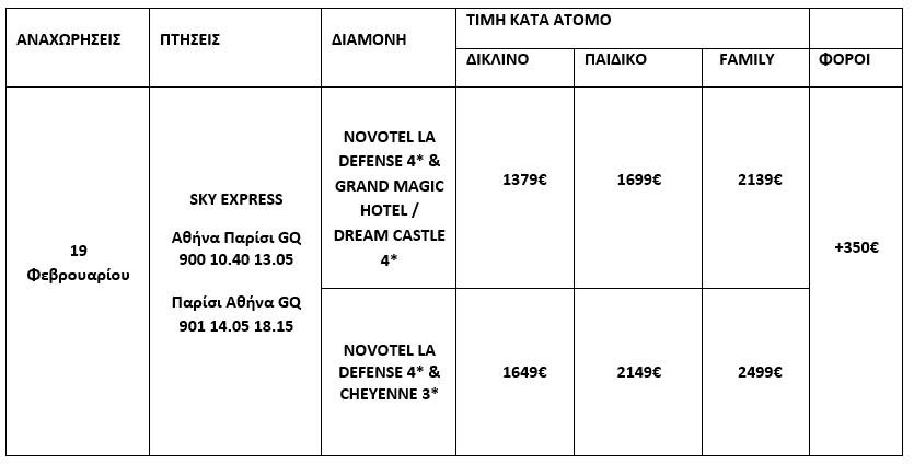 Νέος φόρος πόλης (city tax) υποχρεωτικός και πληρωτέος στα ξενοδοχεία του Παρισιού/ Grand Magic/Dream Castle : € 8,45 κατ’ άτομο τη διανυκτέρευση για 4* ξενοδοχεία. Τα παιδιά κάτω των 12 ετών δεν πληρώνουν στην περίπτωση που μένουν με 2 ενήλικα άτομα στο ίδιο δωμάτιο. Στην περίπτωση που μία οικογένεια (2 ενηλ + 2 παιδιά) καταλαμβάνει 2 δίκλινα δωμάτια, θα πληρώσουν και τα 4 άτομα τα city taxes. Φιλοδωρήματα, αχθοφορικά και ότι δε αναφέρεται στο πρόγραμμα.