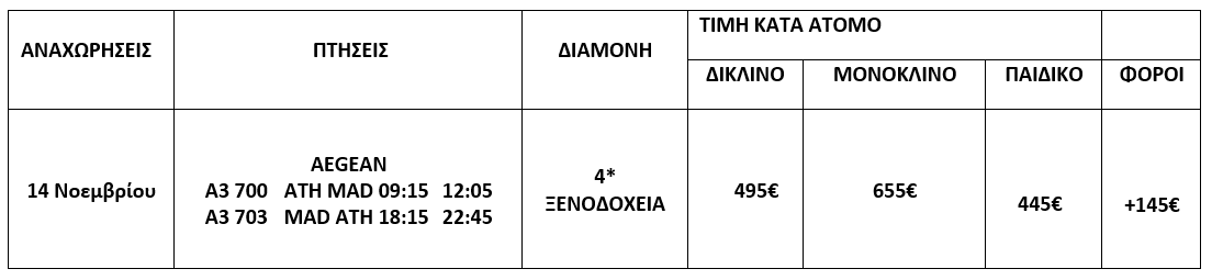 Πτήση από Αθήνα για Μαδρίτη. Άφιξη και αναχώρηση απ’ ευθείας για μια πρώτη γνωριμία με την πόλη μέσω μίας πανοραμικής βόλτας με το λεωφορείο μας. Με στάσεις για φωτογραφίες σε σημεία όπως η Plaza Castilla με τους δίδυμους κυρτούς πύργους της (Puerta de Europa), η αρένα της Μαδρίτης (Plaza de Toros Las Ventas) η μεγαλύτερη της χώρας, Καθώς επίσης και μία βόλτα στο μεγαλύτερο φυσικό πνεύμονα στο κέντρο της πόλης το πάρκο του Retiro, όπου θα δούμε την τεχνητή λίμνη