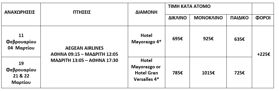 Συνάντηση στο αεροδρόμιο και πτήση για τη Μαδρίτη με την Aegean Airlines. Από το 1561, η ισπανική πρωτεύουσα δεσπόζει στο κεντρικό οροπέδιο της Ιβηρικής Χερσονήσου, στην Καστίλη, και σήμερα αποτελεί μία εντυπωσιακή μητρόπολη με πληθυσμό 4.000.000 κατοίκους. Άφιξη, μεταφορά και τακτοποίηση στο ξενοδοχείο. Το απόγευμα είναι ελεύθερο για μια πρώτη γνωριμία με την πόλη, περπατώντας στη φημισμένη Gran Via, την ιστορική Plaza Mayor και την πολυσύχναστη Puerta del Sol. Προαιρετικά, προτείνεται πανοραμική ξενάγηση με τον αρχηγό μας σε σημεία που δεν περιλαμβάνονται στην προγραμματισμένη ξενάγηση. Θα ανακαλύψουμε τη Μαδρίτη των Βουρβόνων, τις βόρειες συνοικίες της με το εμβληματικό στάδιο Santiago Bernabéu, την Puerta de Europa, την Plaza de Toros – την αρένα ταυρομαχιών της πόλης, την Plaza Colón με το Αρχαιολογικό Μουσείο, την Plaza de España με το μεγαλοπρεπές μνημείο του Θερβάντες, το αιγυπτιακό μνημείο Debod, το πάρκο Retiro και την ιστορική Plaza Mayor. Διανυκτέρευση.