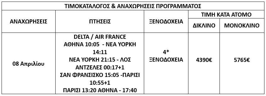 4. ΦΟΡΟΙ/ΑΣΦΑΛΕΙΑ/ESTA/ETA: Το κόστος περιλαμβάνει τους φόρους αεροδρομίων, επίναυλο