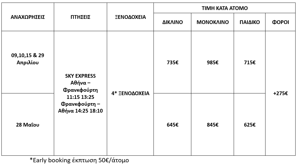 2. Η τιμή «EarlyBooking» ισχύει για κράτηση έως 45 μέρες πριν, προκαταβολή 450€/άτομο επιστρεπτέα έως και 45 μέρες πριν, εξόφληση στις 21 μέρες πριν non-refundable. Παρέχεται η δυνατότητα 6 άτοκων δόσεων με προκαταβολή εφάπαξ 450€.